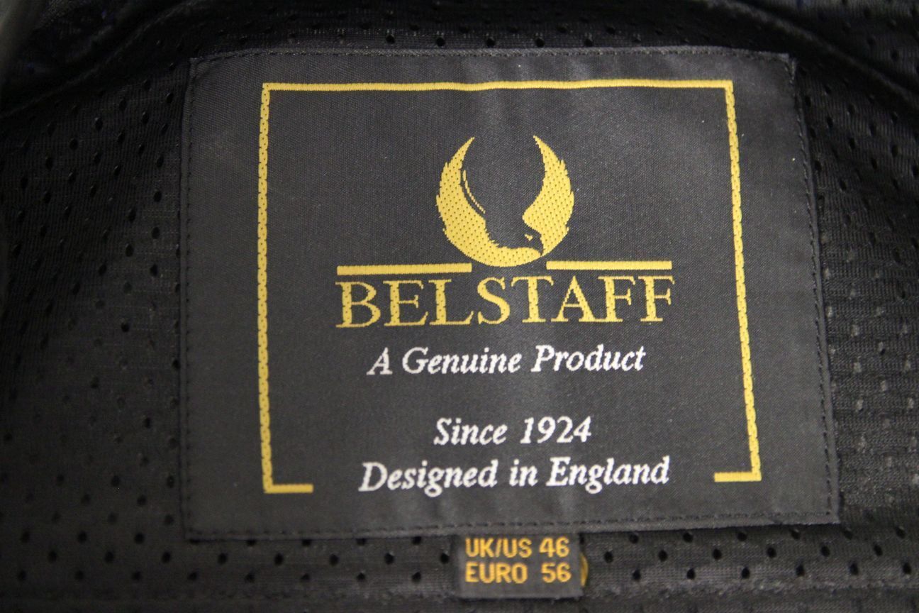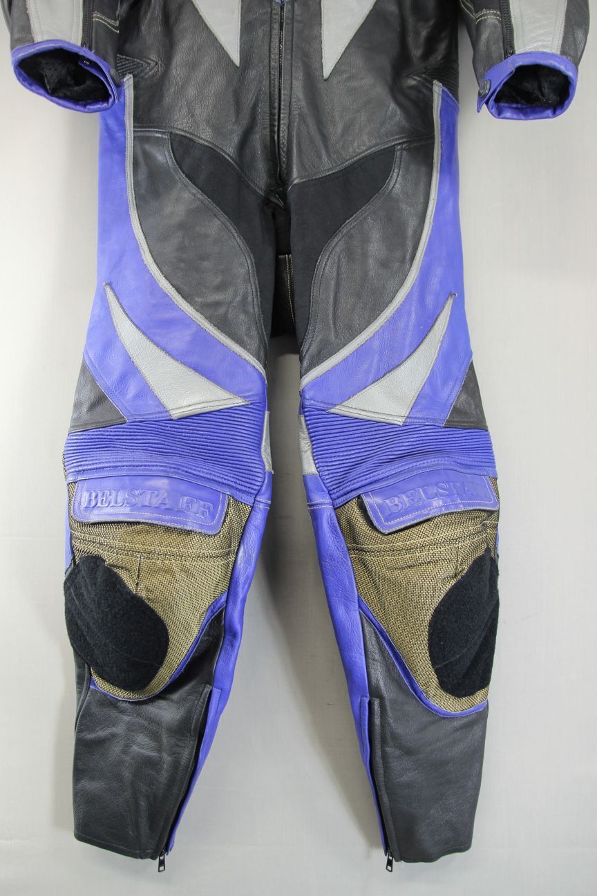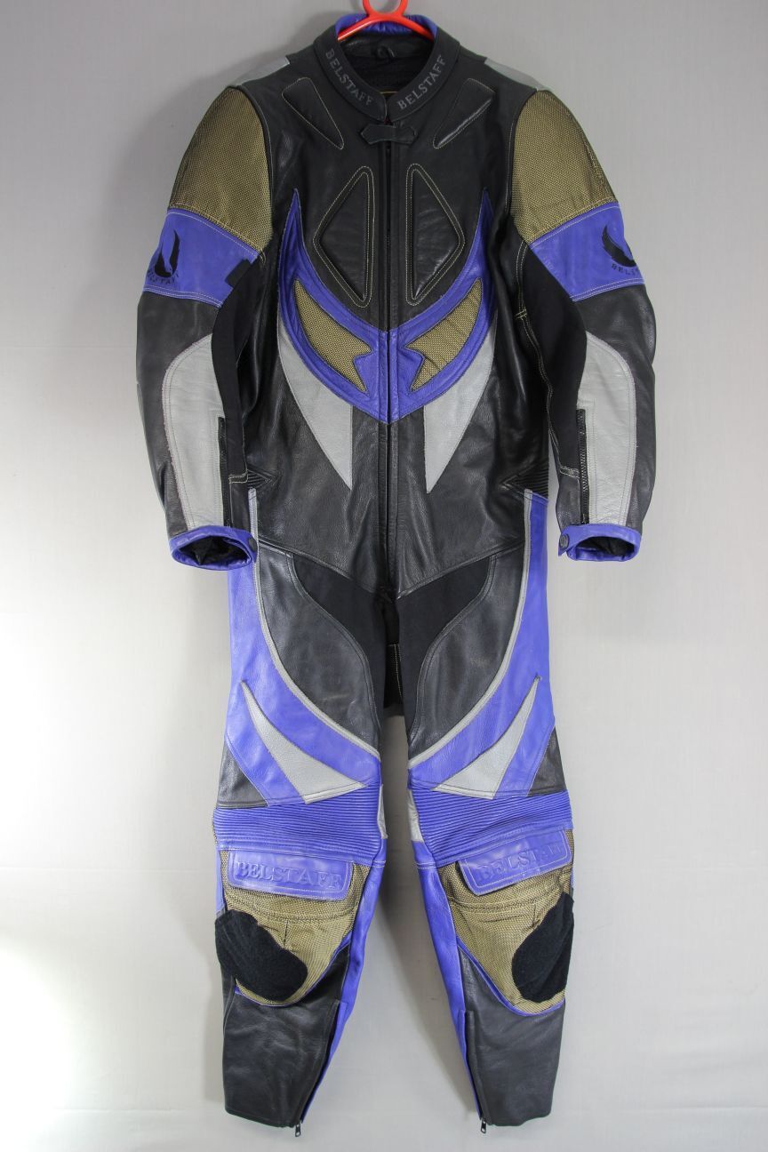 The suit is coloured black, blue and silver. The Belstaff brand name is displayed on both sides of the collar, at the back of the shoulders, on the knees and at the top of the sleeves with the Belstaff logo.