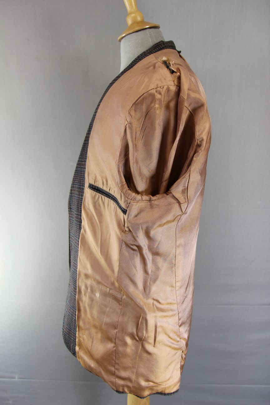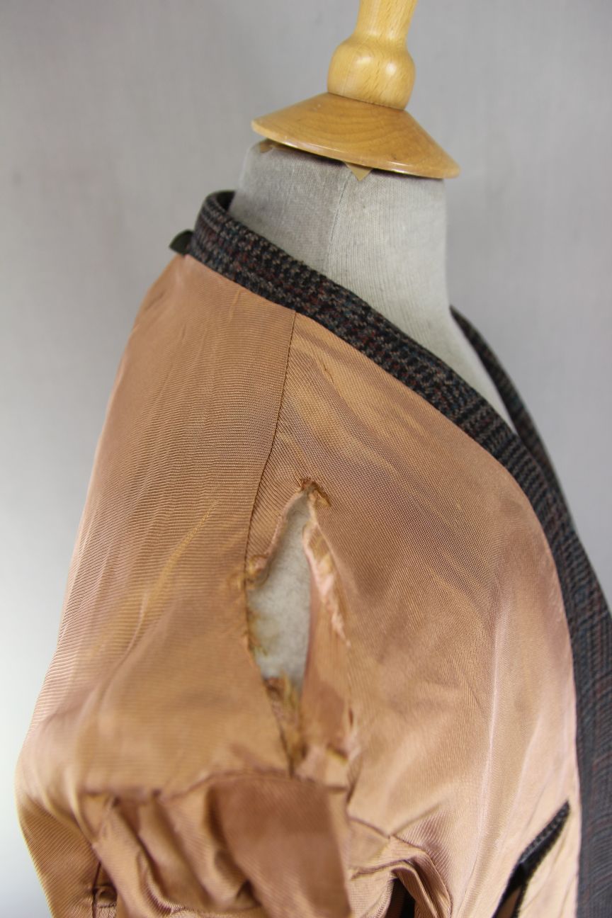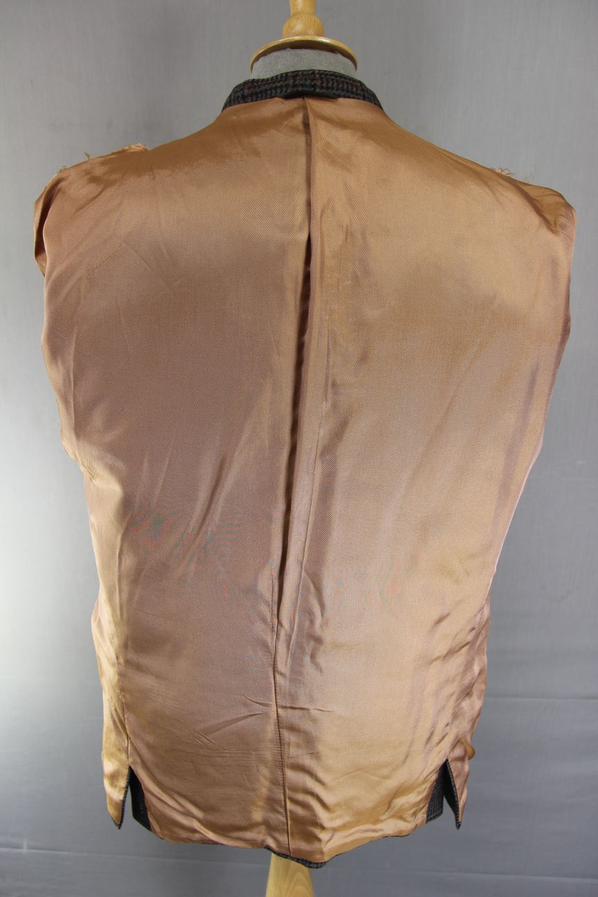 The jacket has a smooth, silky matching brown viscose lining. There are tears to the lining along both shoulders, please see photos.