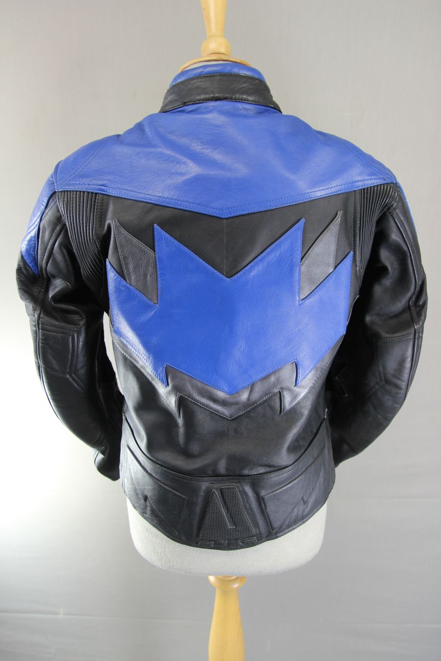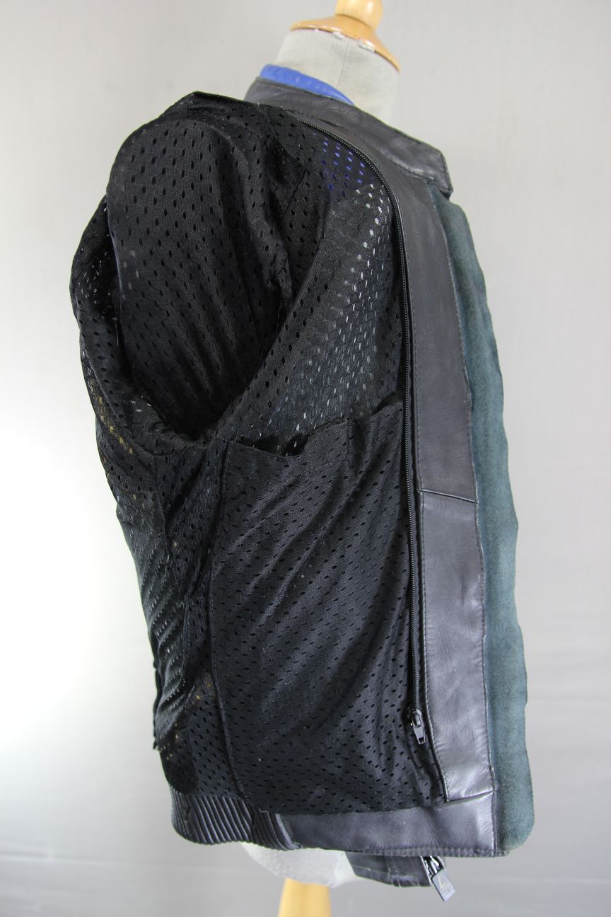 Black, blue & silver leather. There is breathable black kevlar on the sleeves, at the inside of the elbows.