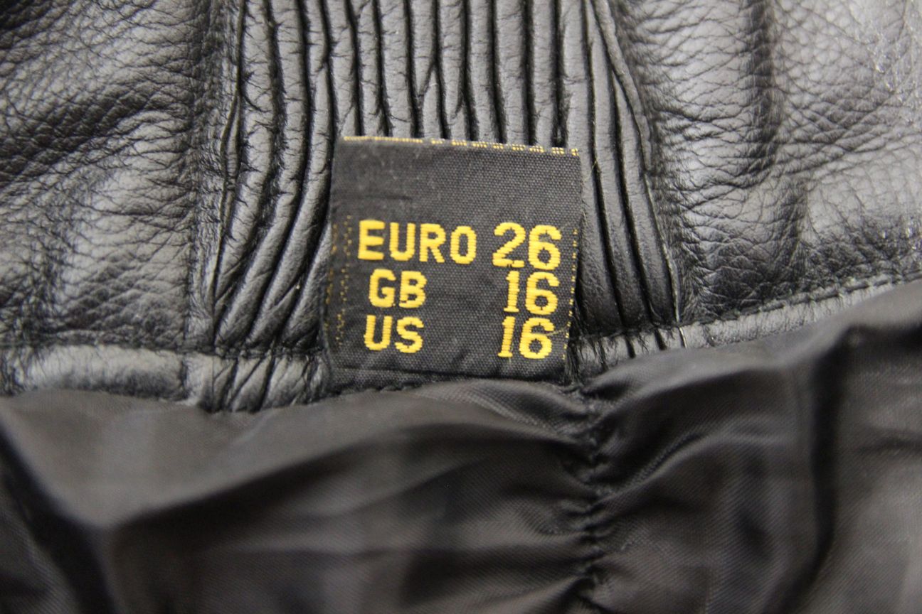 The maker's label shows the size as UK & US 16/European size 26. They will fit a waist of 32 inches and an inside leg of 30 inches according to our measurements. The leather is elasticated at the back of the waistband, so it will stretch a little if required.