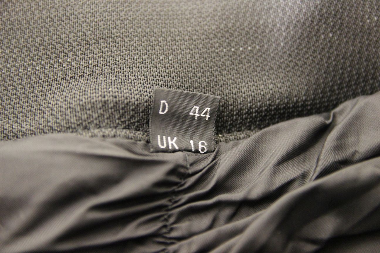 The maker's label shows the size as a UK woman's size 16 or German/European size 44. They will fit a waist of around 28 inches and an inside leg of 30 inches according to our measurements. The back of the waistband is made from an elasticated textile material, so it will stretch a little if required.