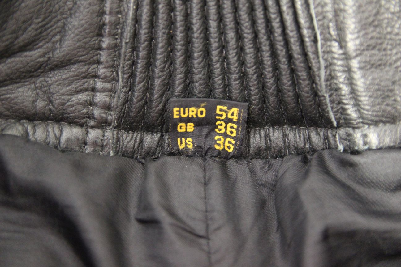 The maker's label shows the size as UK & US 36 inches/European size 54. These will fit a waist of 36 inches and an inside leg of 29 inches according to our measurements. The leather is elasticated at the back of the waistband, so it will stretch a little if required.