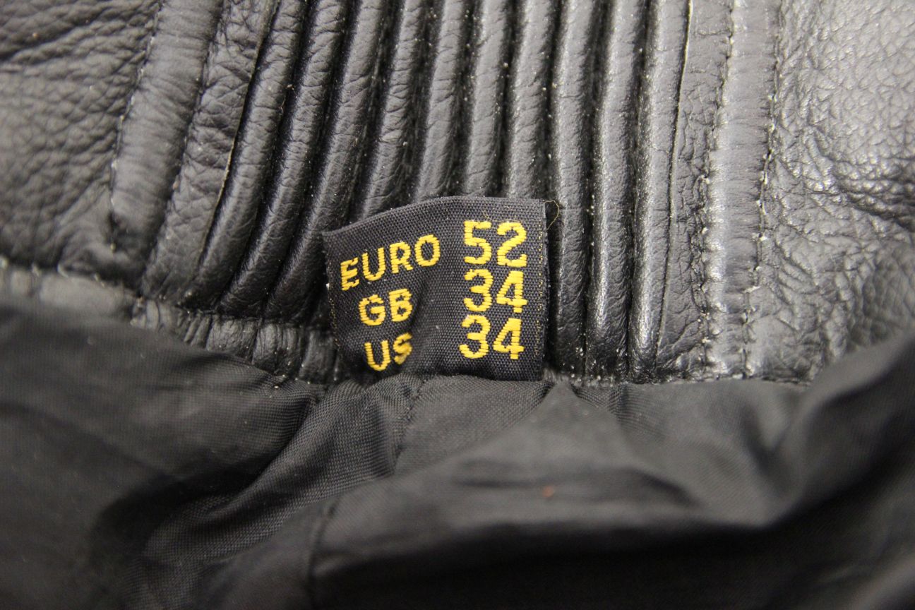 The maker's label shows the size as UK & US 34 inches/European size 52, short fit. These will fit a waist of 32-34 inches and an inside leg of 26 inches according to our measurements. The leather is elasticated at the back of the waistband, so it will stretch a little if required.