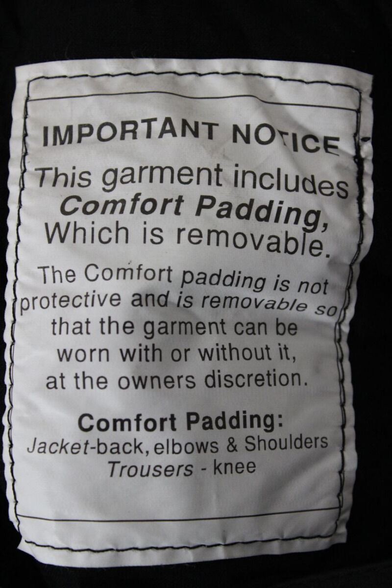 Comes with removable comfort padding at the knees (see photo of label), held in velcro fastened 'pockets' on the leather. There is also built in protection at the knees/shins and there is built in padding at the hips.