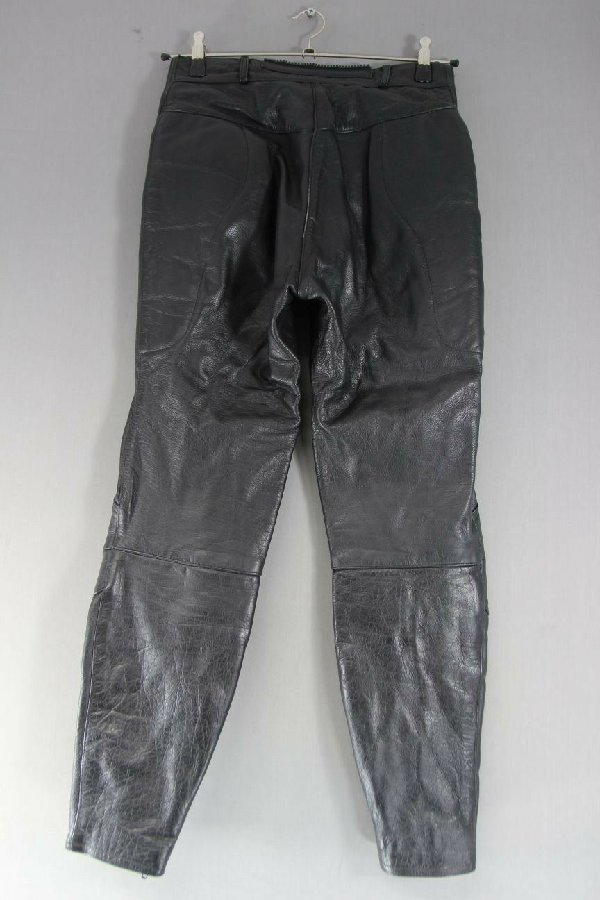 Will fit a waist of around 28 inches and an inside leg of 29 inches. The maker's label confirms the size as a UK 12/European size 38 but please check our measurements to ensure they will fit you. The leather is elasticated at the sides at the waist, so the waistband will expand a little if needed.