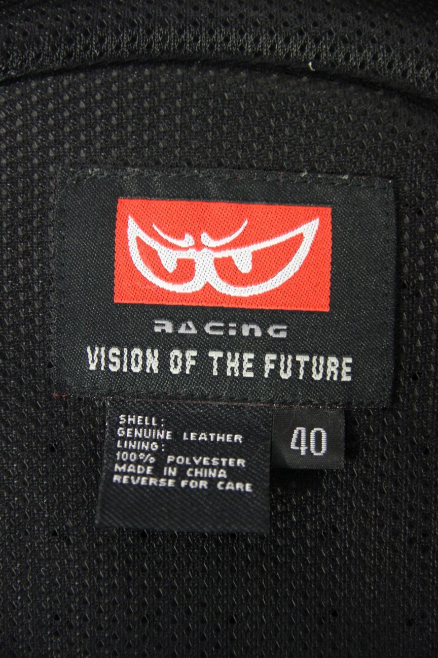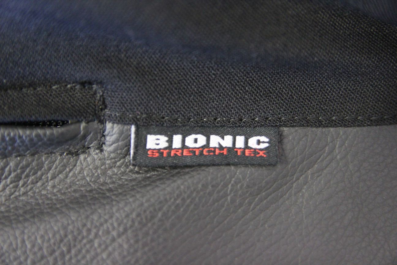 The leather is coloured black & white, with reflective trim across the back of the shoulders. Some of the leather is perforated for ventilation. Partly made from breathable black 'Bionic Stretch Tex' textile material.