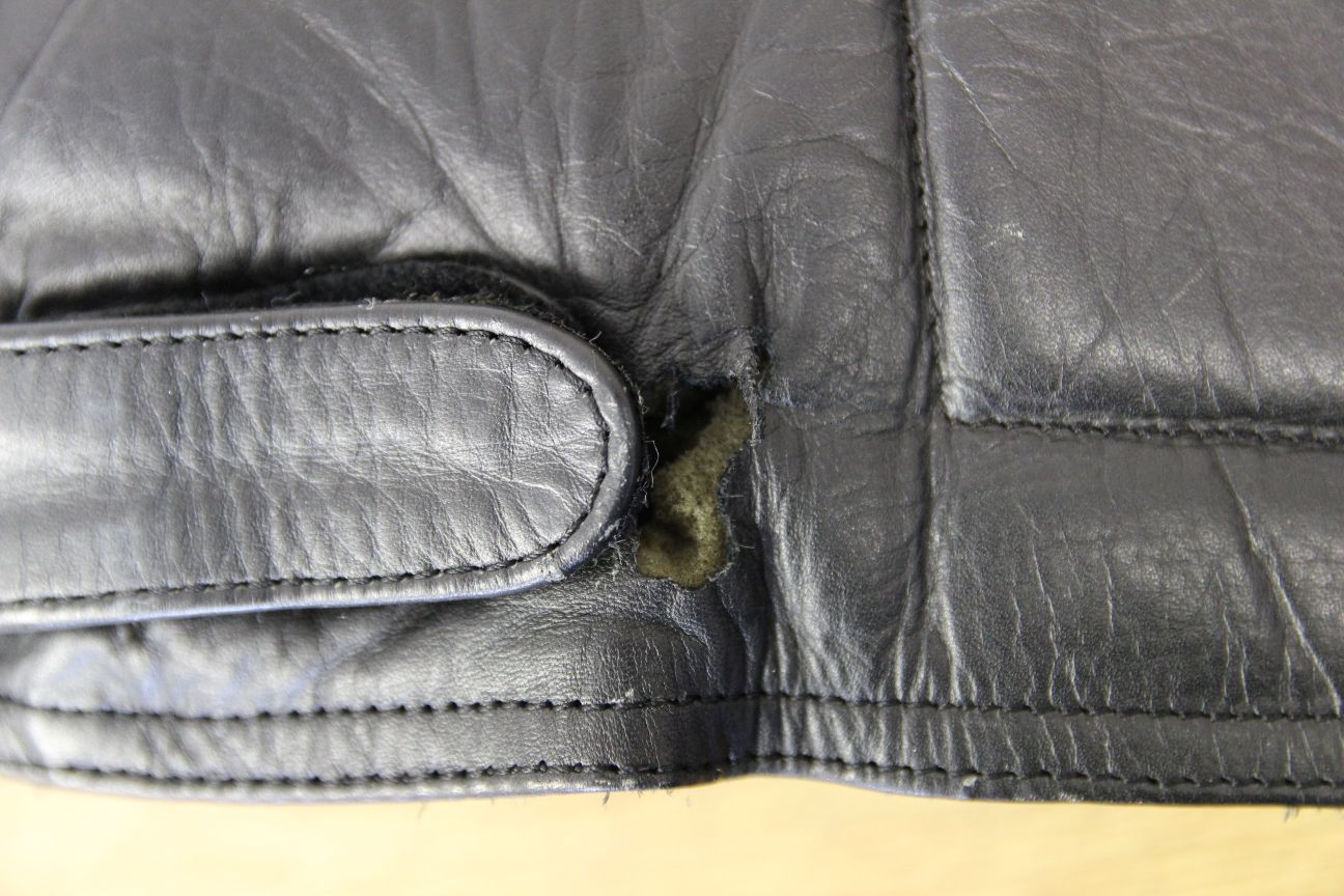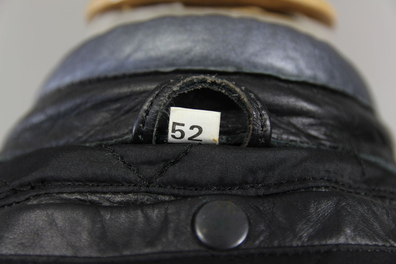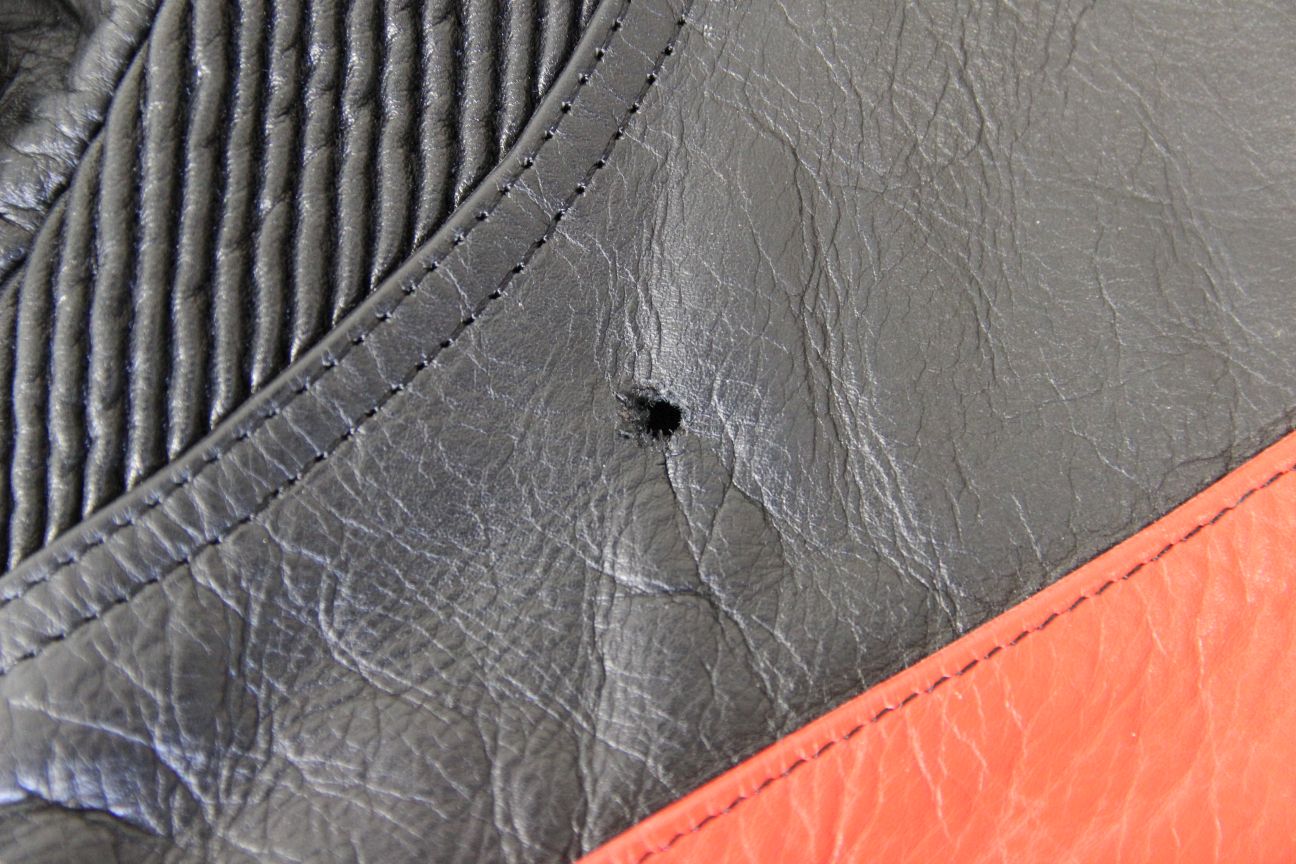 Made from black, silver, red & blue leather. There are a couple of small areas of damage to the leather at the back, please see photos - one alongside the left waist strap and another near the top of the left sleeve.