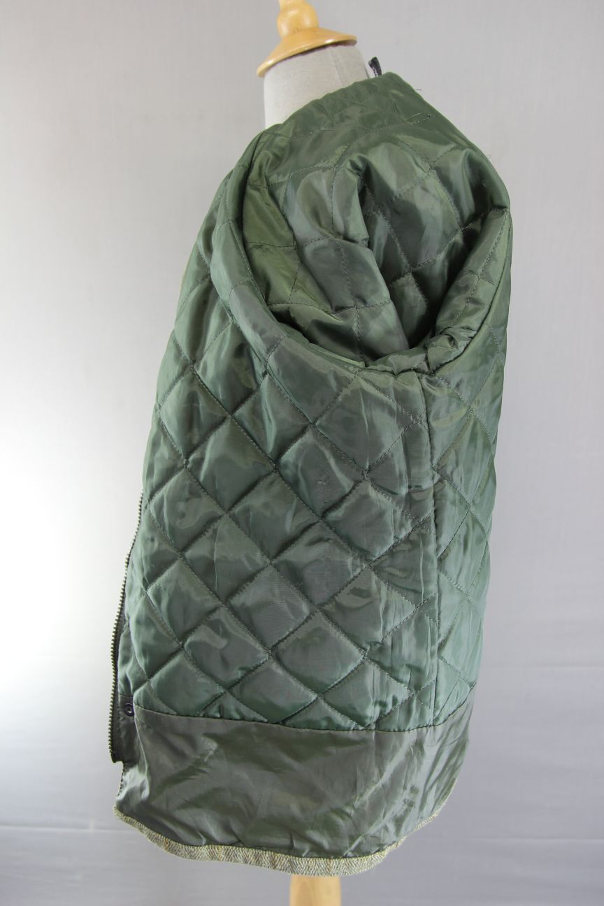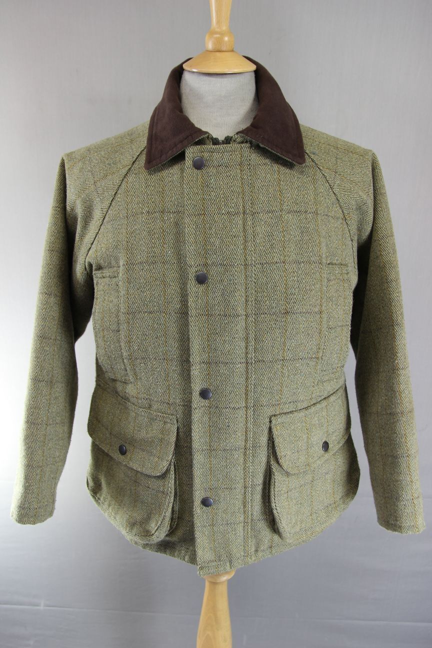 A SUPERB QUALITY WOOL BLEND COUNTRY COAT WITH WARM QUILTED (YET WATERPROOF & BREATHABLE) LINING. GREAT FOR HUNTING, SHOOTING, FISHING, ETC, WITH MULTIPLE POCKETS. MADE FROM CHECKED HERRINGBONE PATTERNED TWEED.