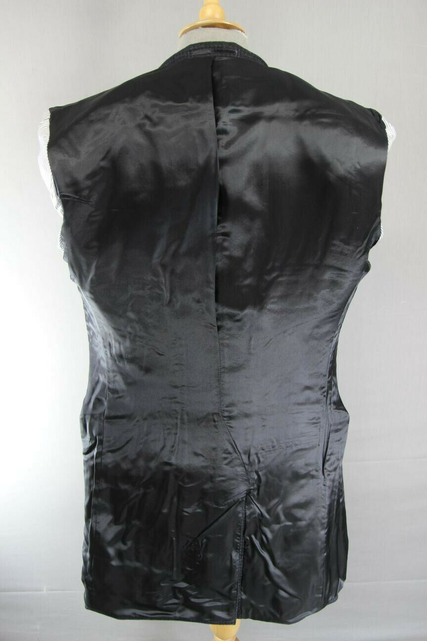 The coat has a smooth, silky black viscose body lining. The sleeve lining (51% acetate/49% viscose) is white with black pinstripes.