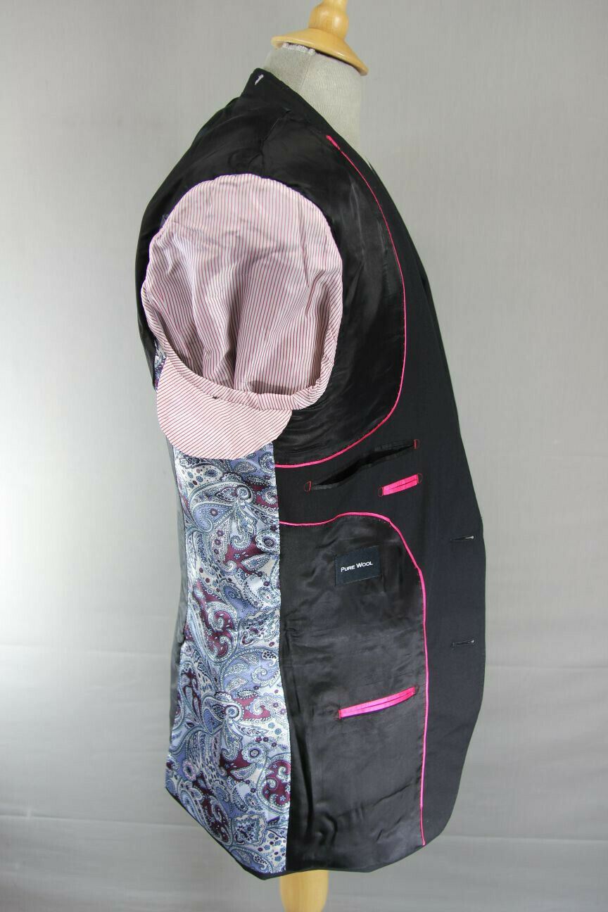 The jacket has a smooth, silky, matching black viscose/polyester lining with pinstriped sleeve linings and a paisley style pattern at the sides under the arms.