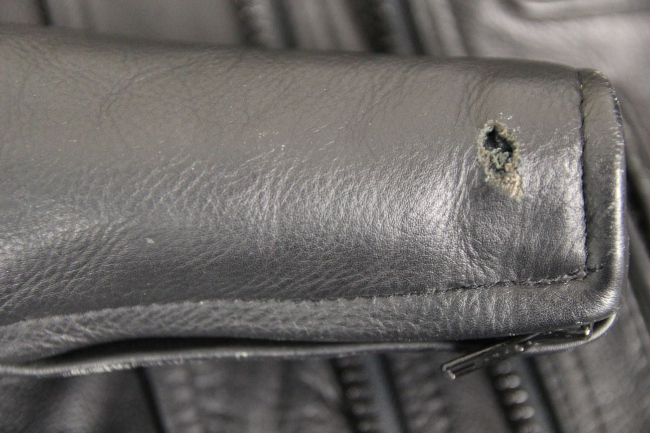 There is a tiny hole in the leather on the right sleeve, near the cuff, please see photo. Otherwise, the jacket is in excellent overall condition.