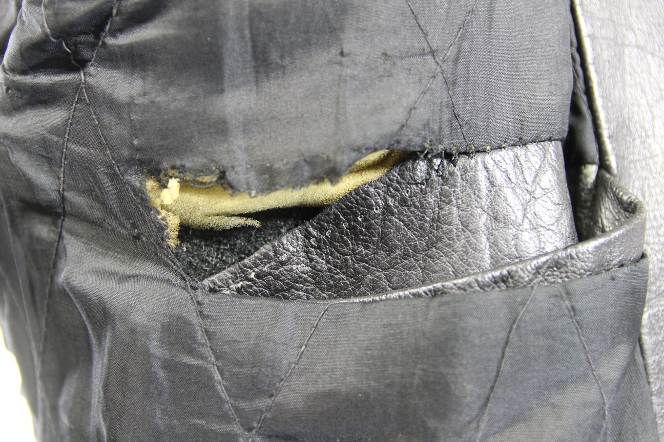 The leather is in very good overall condition; there are some small holes in the lining and some stitches missing along the seam where the lining meets the leather at the top of the inside pocket, please see photos.