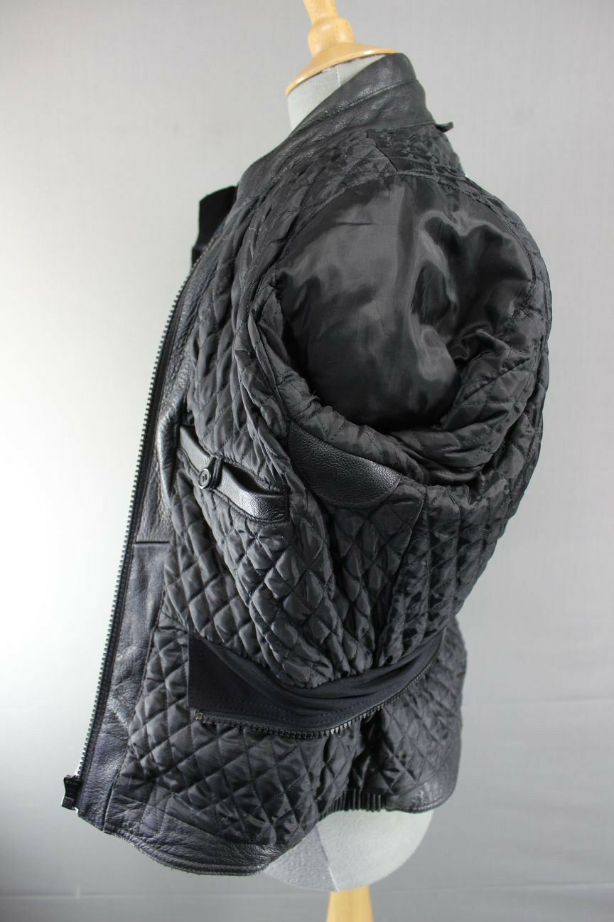 The jacket has a quilted black lining. There are leather panels on the lining under the arms.