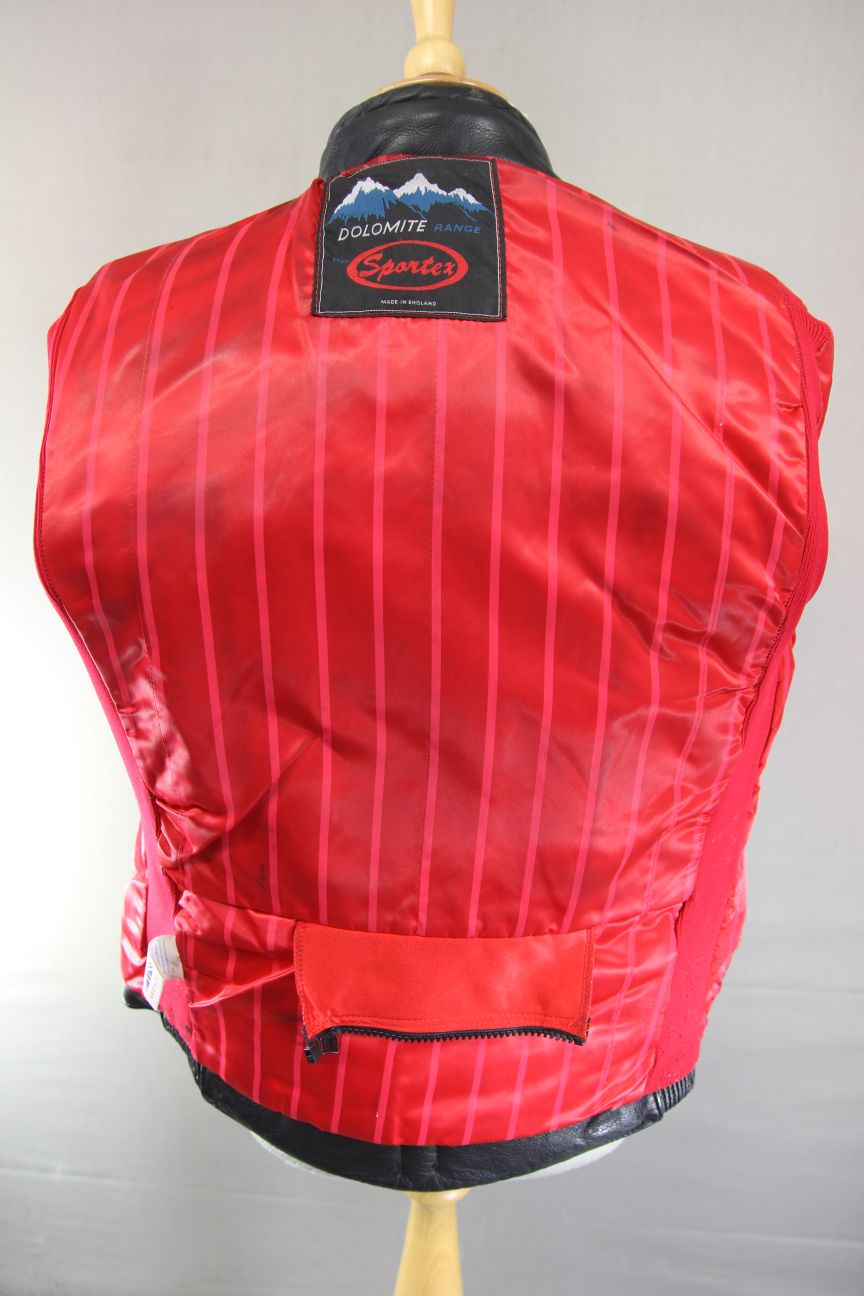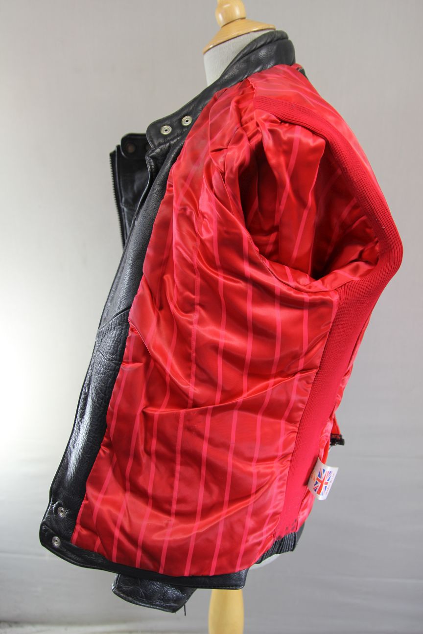 The jacket has smooth, silky striped red lining, breathable at the sides.
