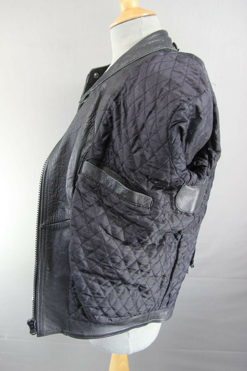 The jacket has a black quilted lining. There are leather panels on the lining under the arms.