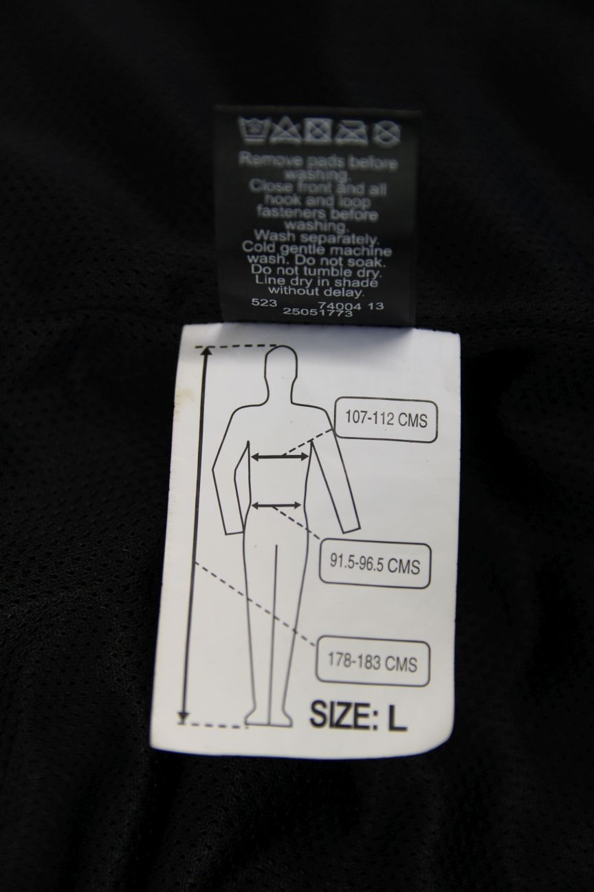 The maker's label shows the size as L (large). Please read the measurements carefully to check if it will fit you, but we think it will fit a chest of around 42-44 inches (107-112 cm). The label suggests it will fit someone of about 178-183 cm (5 ft 10 in - 6 ft), with a waist of 91.5 - 96.5 cm (36 - 38 in). The sleeves and waist can be adjusted as required.