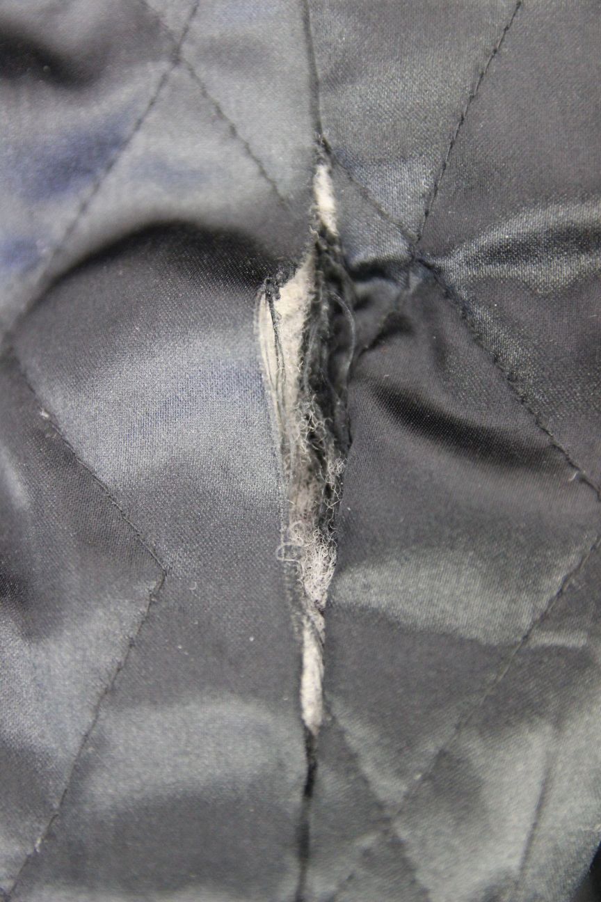 The jacket has a breathable black lining and comes with an additional quilted black lining, attached by a series of stud fasteners. There is a tear along one of the seams on the additional liner, see photo.