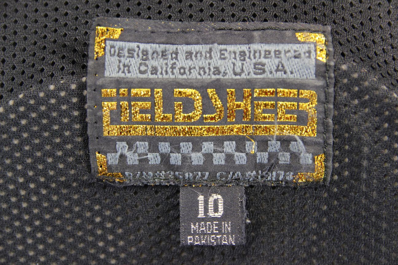 FIELDSHEER BLACK, BLUE & SILVER LEATHER BIKER JACKET WITH PROTECTORS: SIZE 10