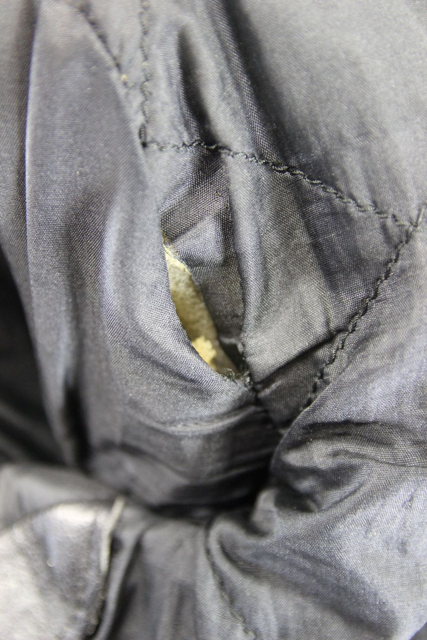 The jacket has a quilted black lining. There are a few stitches missing along the seam of the lining at the top of the left sleeve, as pictured, which could easily be restitched.