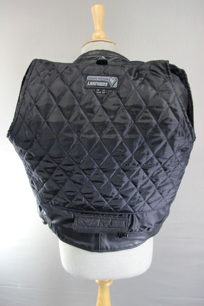 FRANK THOMAS BLACK LEATHER BIKER JACKET WITH CE ARMOUR & THERMAL LINING: SIZE 12