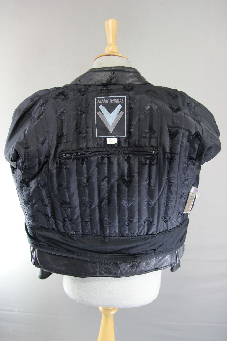 FRANK THOMAS BLACK LEATHER BIKER JACKET WITH REMOVABLE PROTECTORS SIZE 12/34-36"