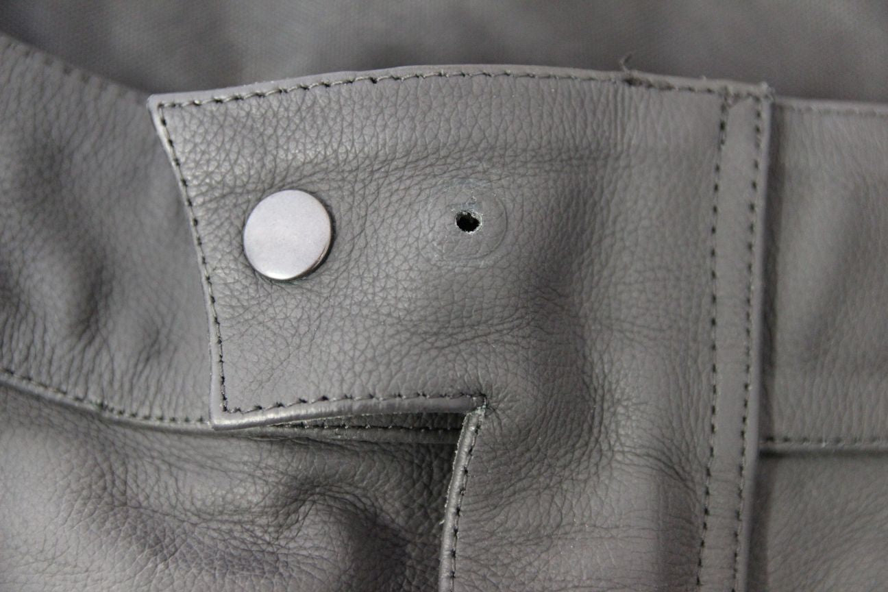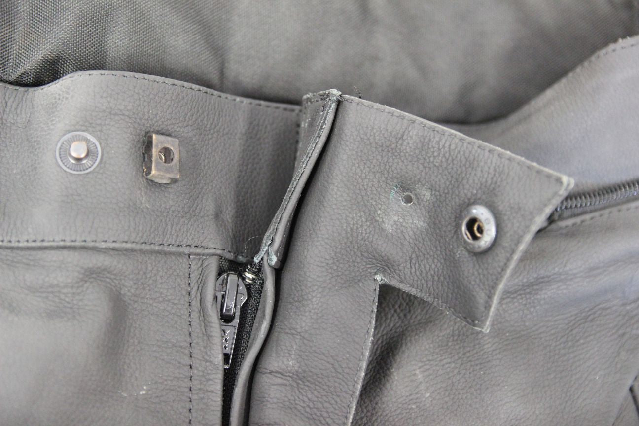 Fastened by a zip, with strap with popper at the waist and zips at the bottom of the legs. The metal clasp alongside the popper on the waist strap is now missing, which is not an issue, please see photos.