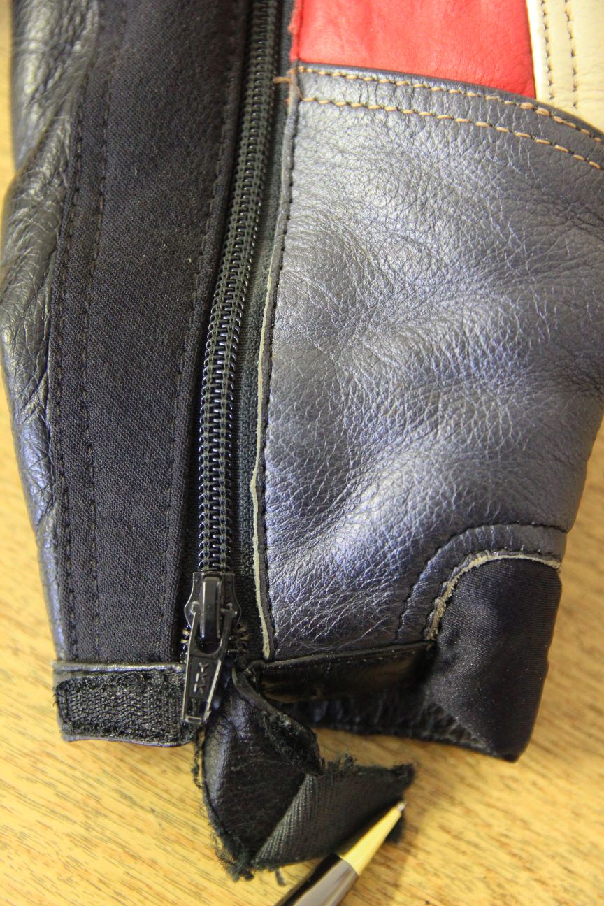 There are straps with velcro at the top of the zip and on the cuffs and there is a strap with 2 poppers at the waist. The left cuff strap is still usable but the fastening for the velcro has partially come away from the leather, please see close-up photo.
