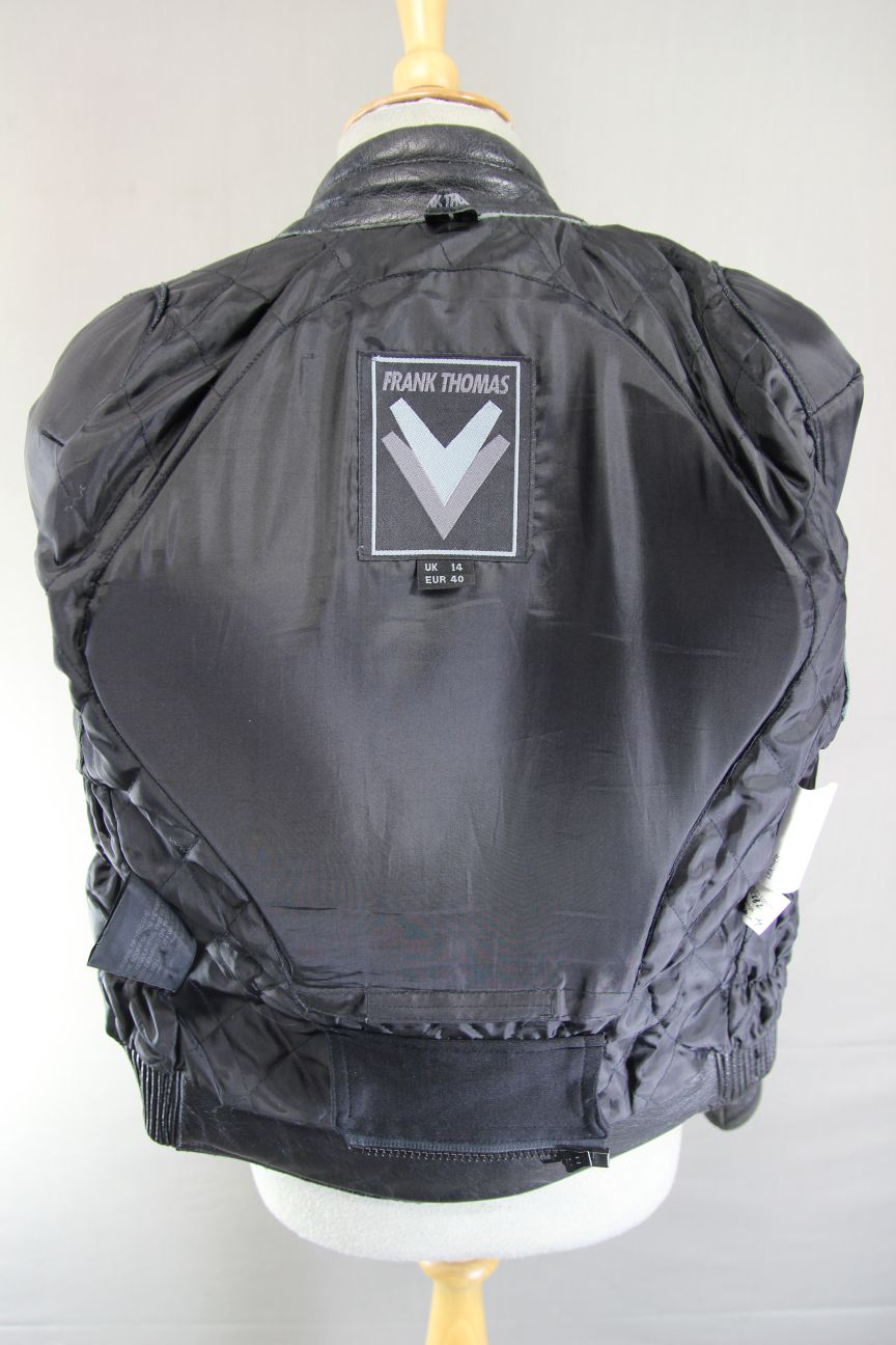 FRANK THOMAS CLASSIC BLACK LEATHER BIKER JACKET WITH BACK PROTECTOR: SIZE 14