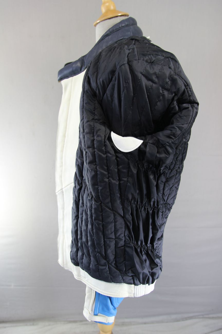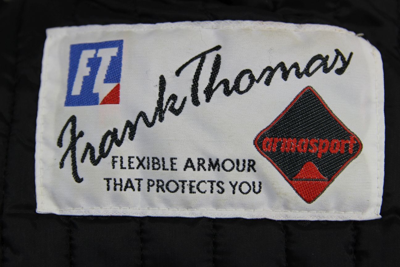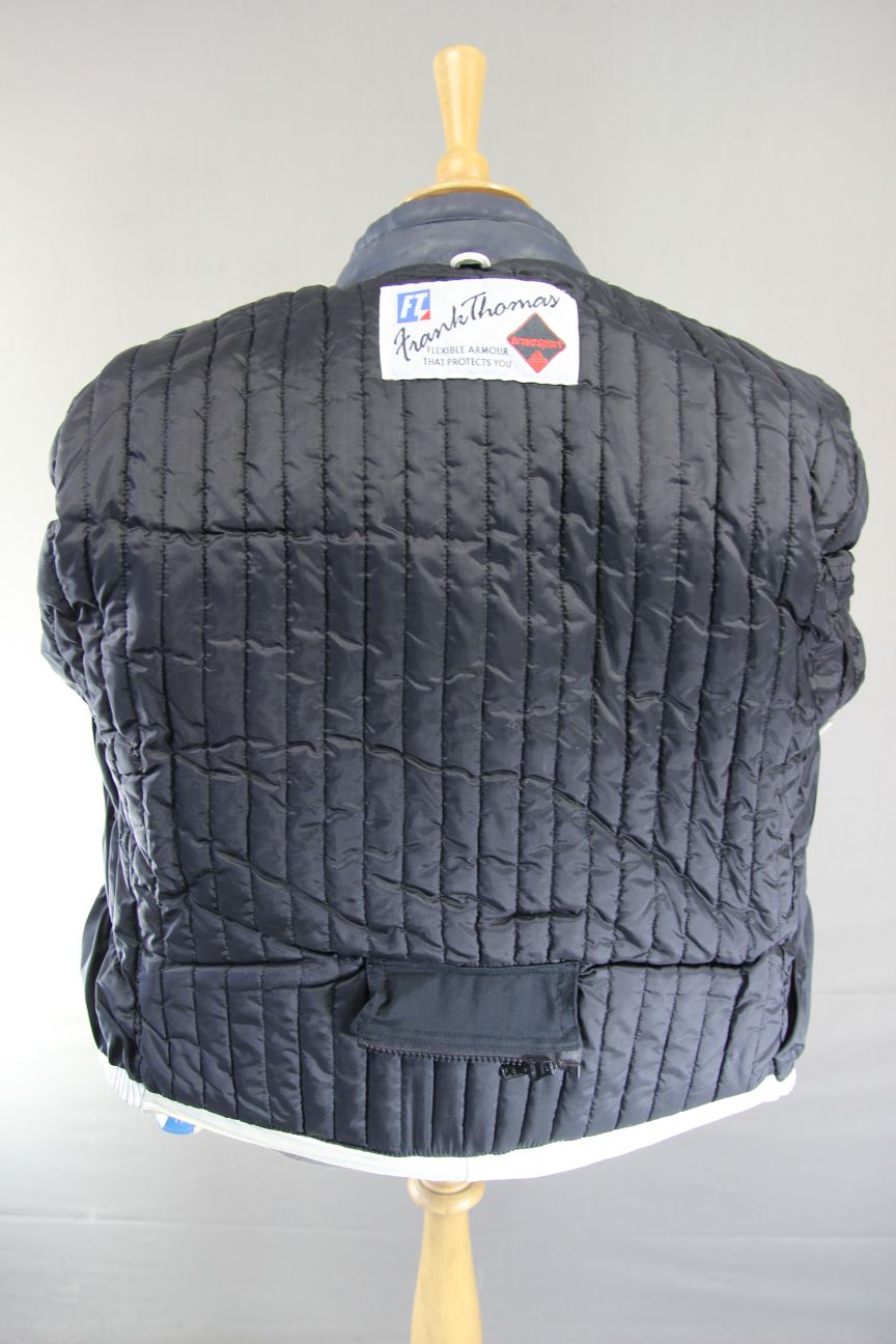 The jacket is white, navy (dark) blue and sky (light) blue. The Frank Thomas brand name is displayed on the waist strap, with FT on the neck strap, a Frank Thomas logo at the top of the left sleeve and 'Armasport' at the top of the right sleeve.