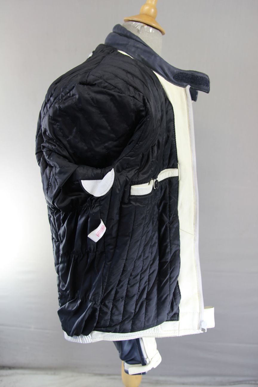 FRANK THOMAS WHITE, DARK BLUE & LIGHT BLUE LEATHER ARMASPORT BIKER JACKET 44 IN