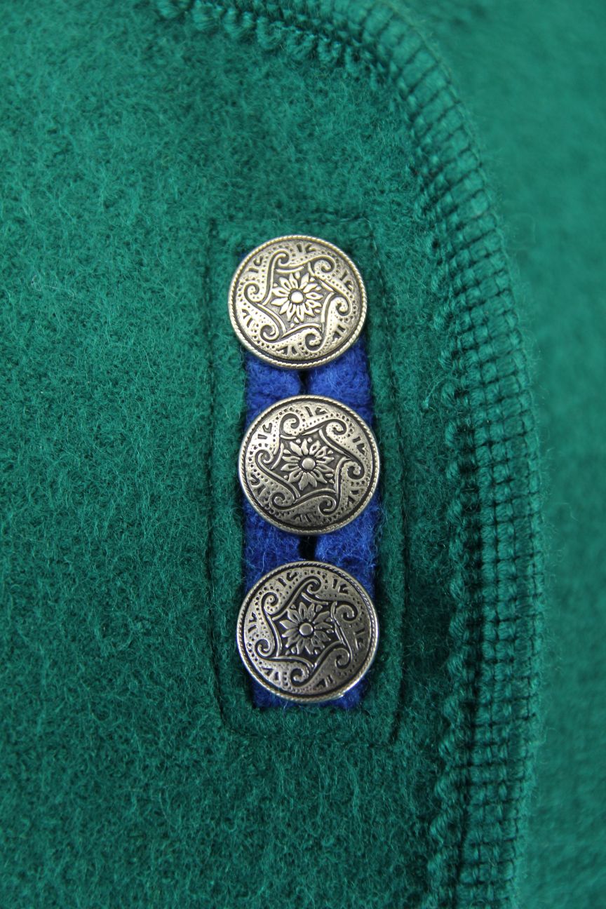 The jacket is green, with blue buttonholes, please see photos. The Giesswein brand name is displayed on a metal tag just above the waist at the front on the left.