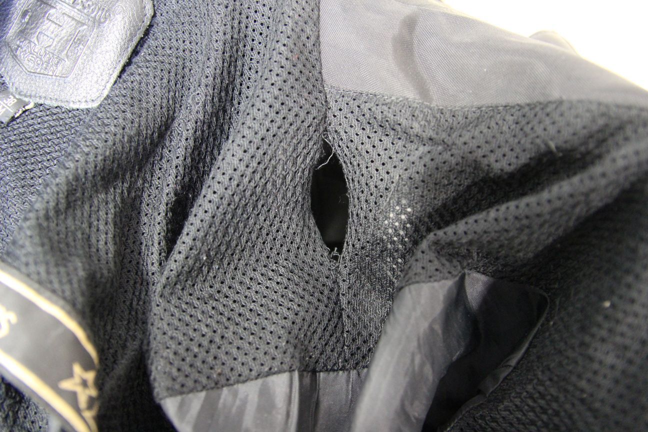 The jacket has a breathable black mesh lining. There is some minor damage to the lining in a few places, e.g. missing stitches along seams, please see photos.