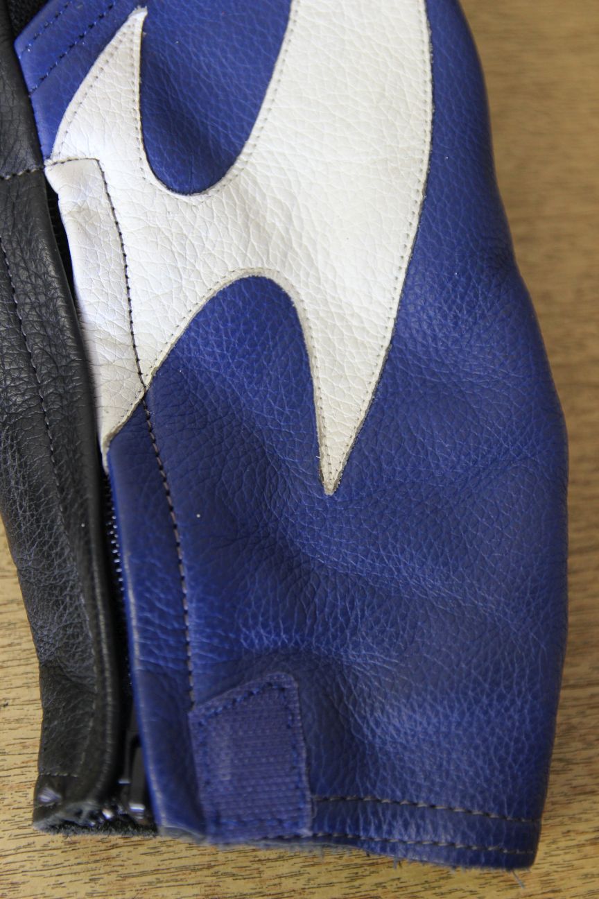 The leather is elasticated behind the sleeves, above the elbows and down the sides of the jacket, and at the back of the waist and above the knees on the trousers.