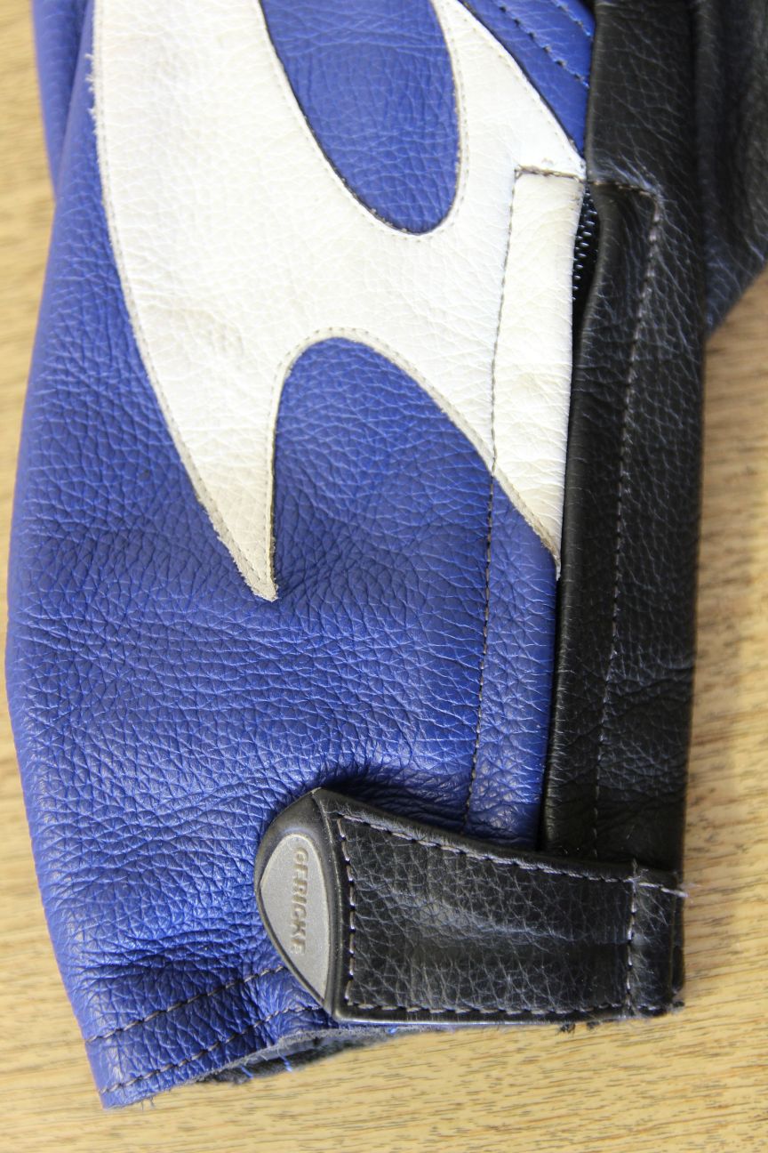 HEIN GERICKE 2 PIECE BLACK, BLUE & WHITE LEATHER BIKER SUIT + CE ARMOUR: SIZE 14
