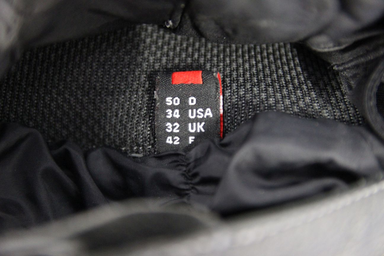 The suit has a black polyamide lining. There are leather panels on the lining under the arms.