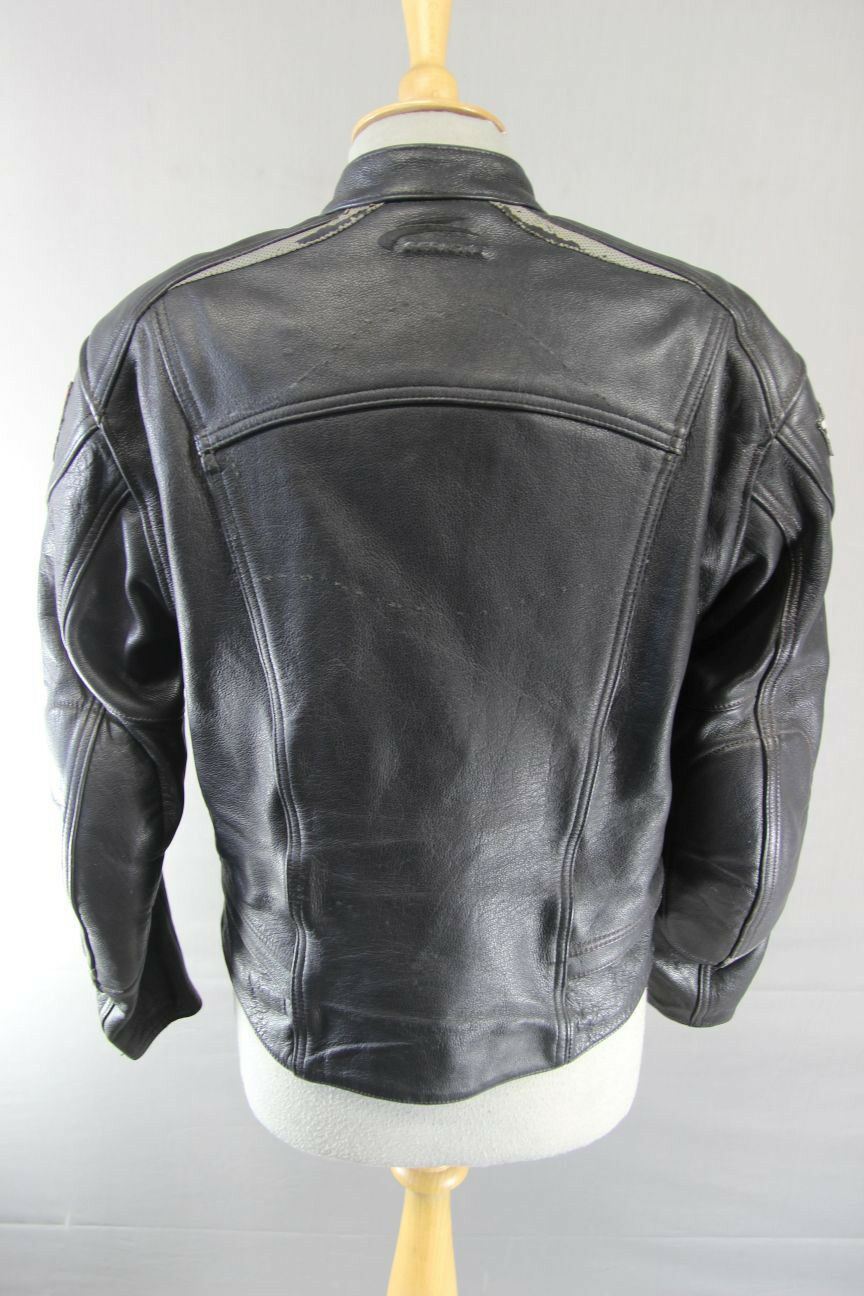 The jacket is black with reflective grey trim. The reflective trim has started to flake off in places, please see photos. There are cloth 'Lady Harley' and 'Ace Cafe London' badges at the top of the left and right sleeves respectively. The Gericke brand name/logo is displayed across the back of the shoulders and on the left sleeve near the cuff.