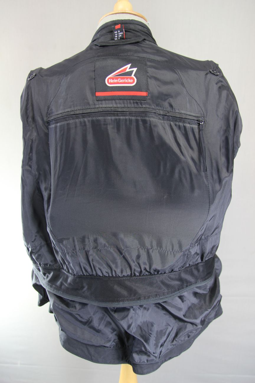 There is a zipped pocket on the lining with a removable back protector. The jacket is fitted with shoulder and elbow/forearm Hiprotec Comfort CE armour, attached to the inside of the lining with Hein Gericke Snap System fasteners (the armour is accessed via an opening at the back of the back protector pocket).