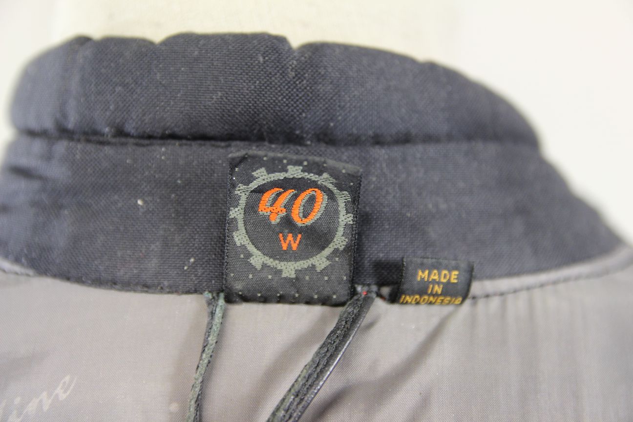 The jacket has a grey polyamide lining. The underarms are reinforced with leather patches.