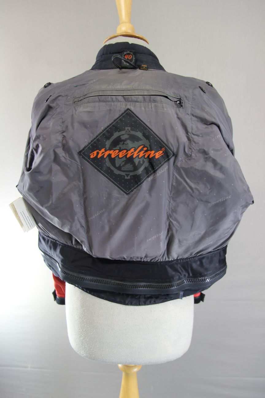 The jacket is silver, black & red and has 3M Scotchlite reflective panels at the top of each sleeve. 'Gericke' is displayed across the back of the collar, with 'Streetline' on the main zip puller.