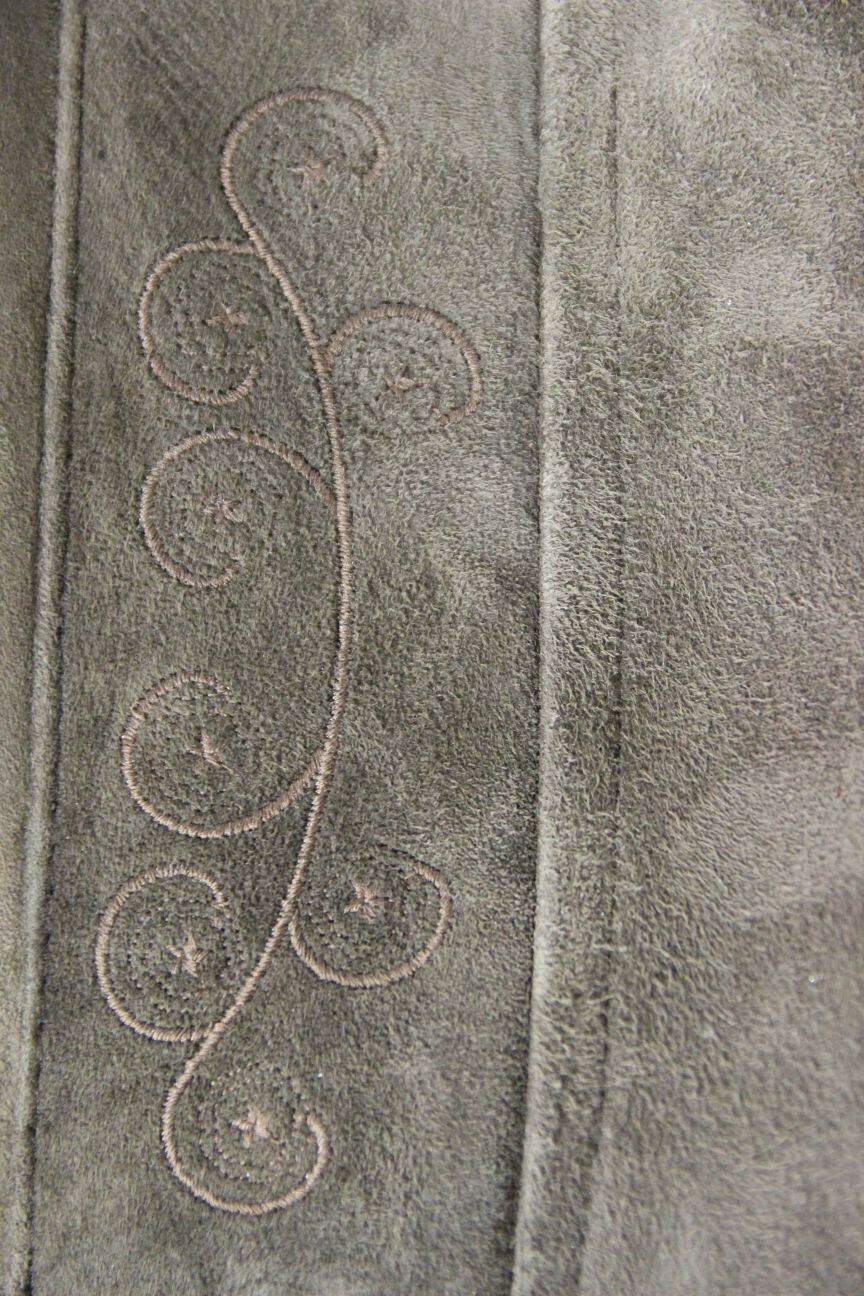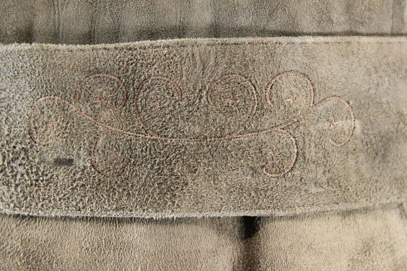 The coat has a black sheepskin collar and dark brown sheepskin lining and features superb embroidered patterns on the pocket tops and on the strap at the back of the waist, as pictured.