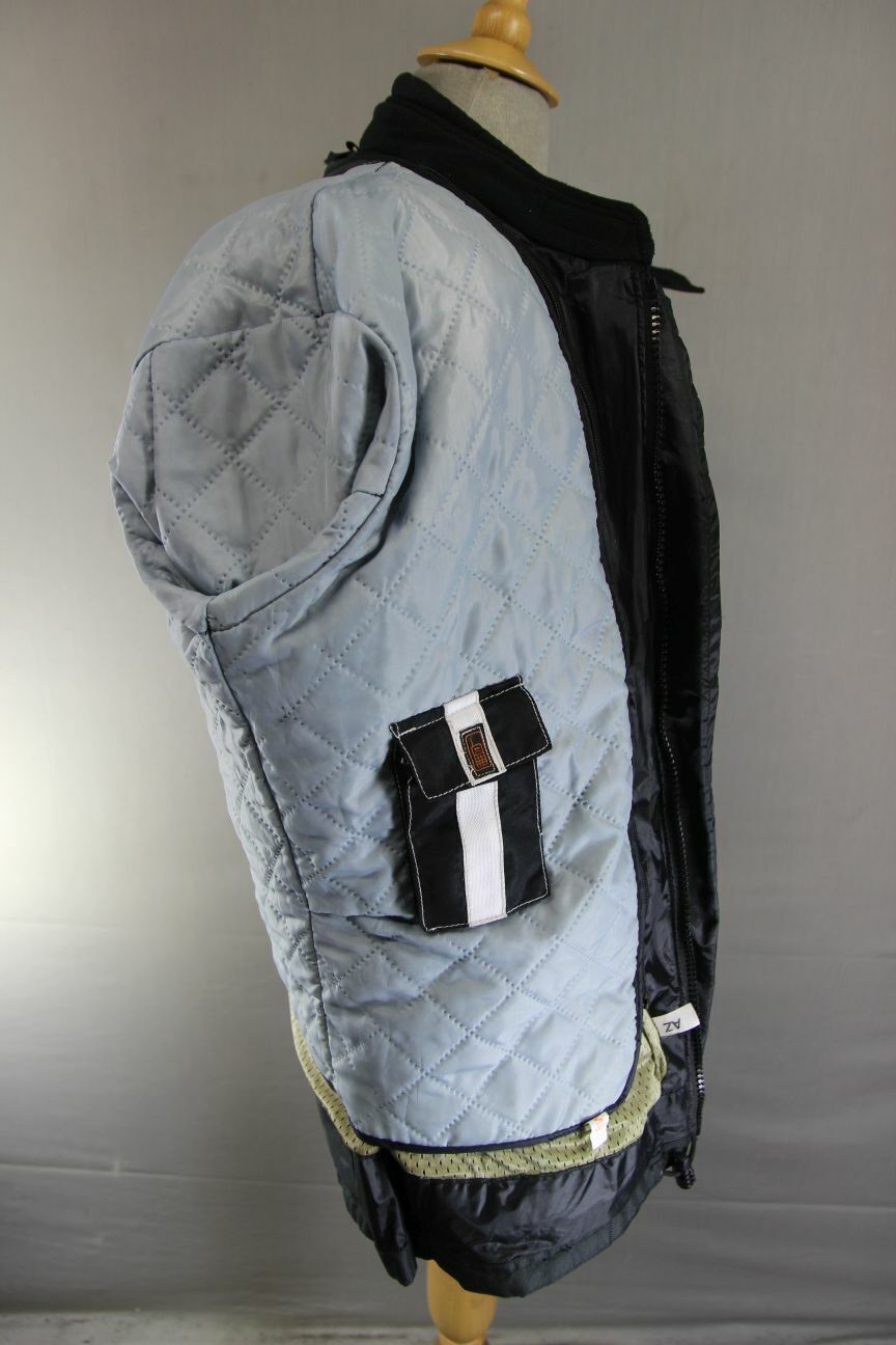 Supplied with removable shoulder and elbow/forearm CE armour, held in velcro fastened 'pockets' on the lining, and a removable back protector, held in a similar pocket (the back protector is not CE marked).