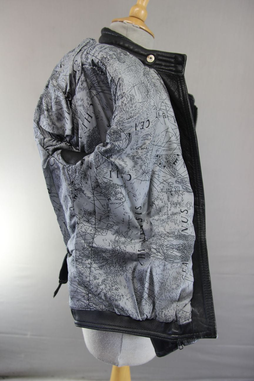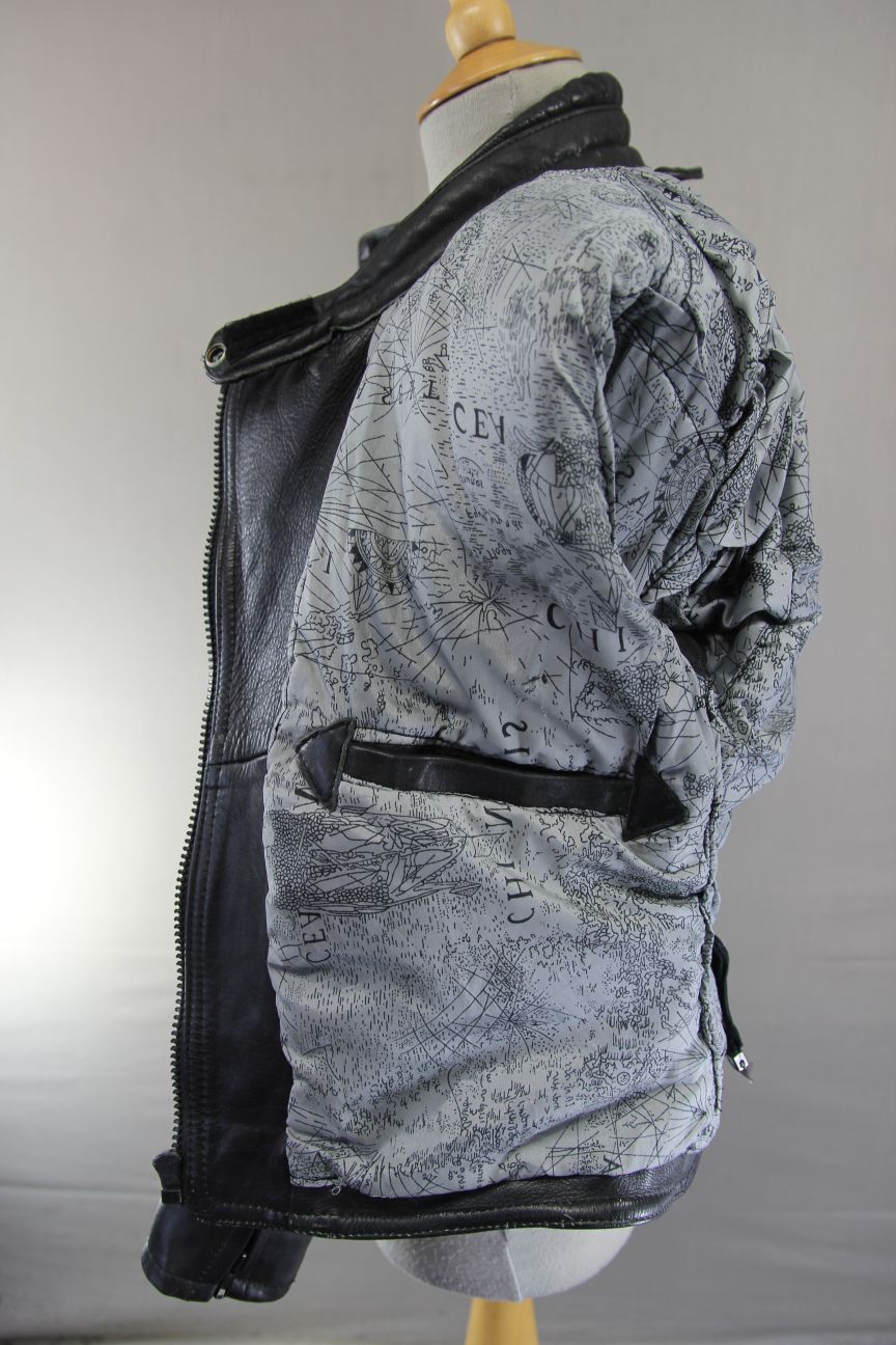 The jacket has a patterned silver coloured lining. There are leather panels on the lining under the arms.