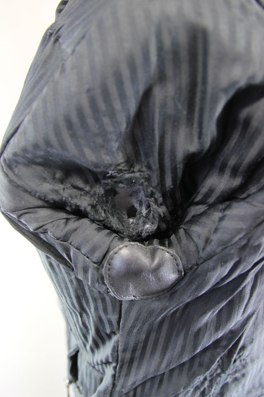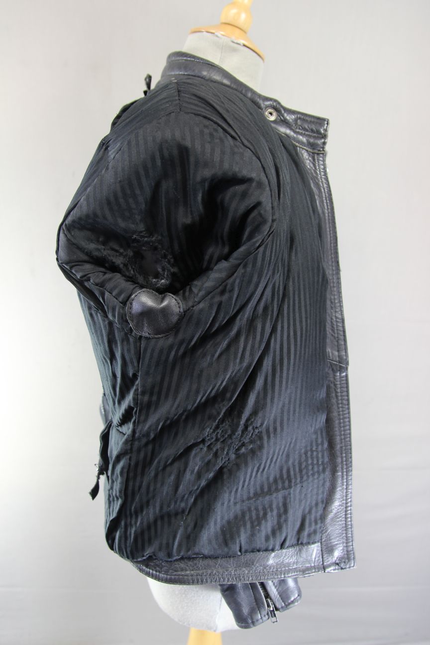 The jacket has a striped black lining. There are leather panels on the lining under the arms. There is a tear to the lining at the top of the left sleeve, please see photos.