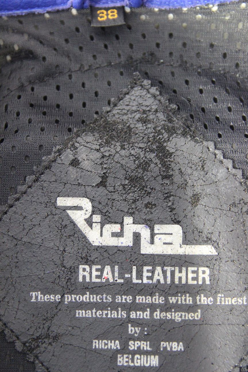 The leather is coloured blue, white & red. There is a reflective strip across the back of the waist on the jacket.