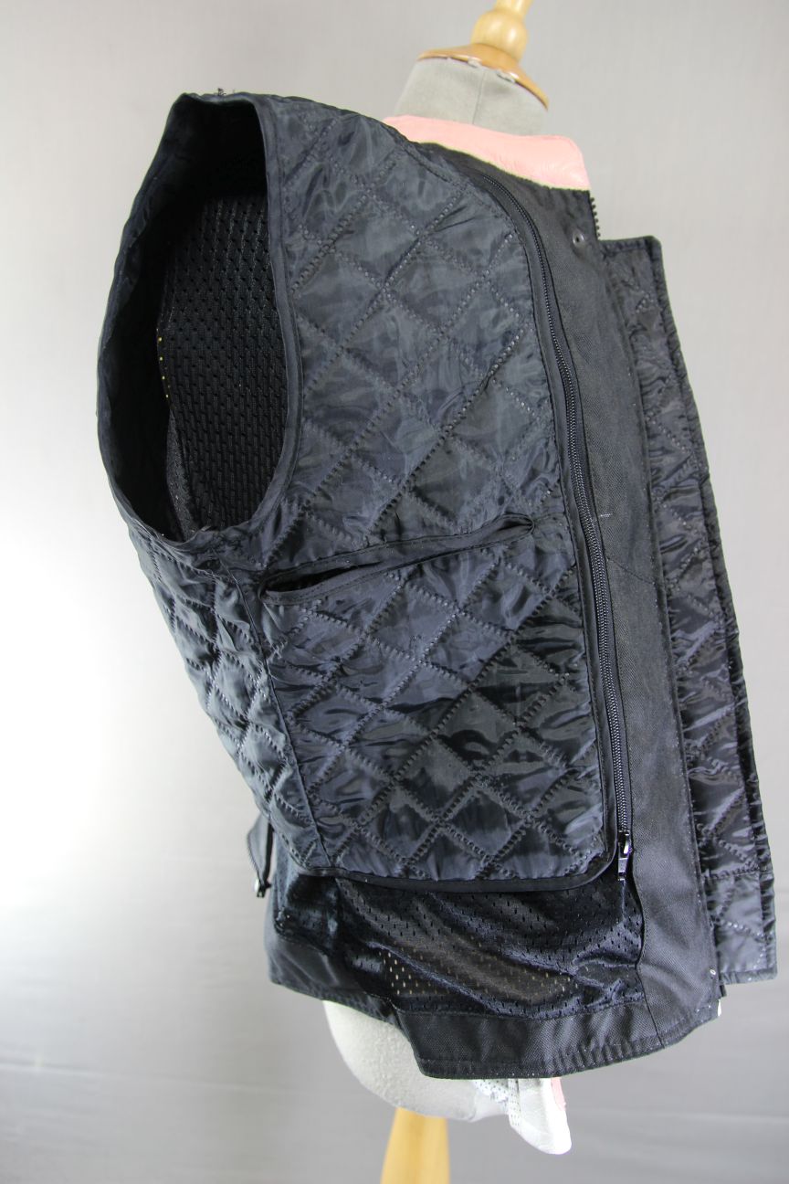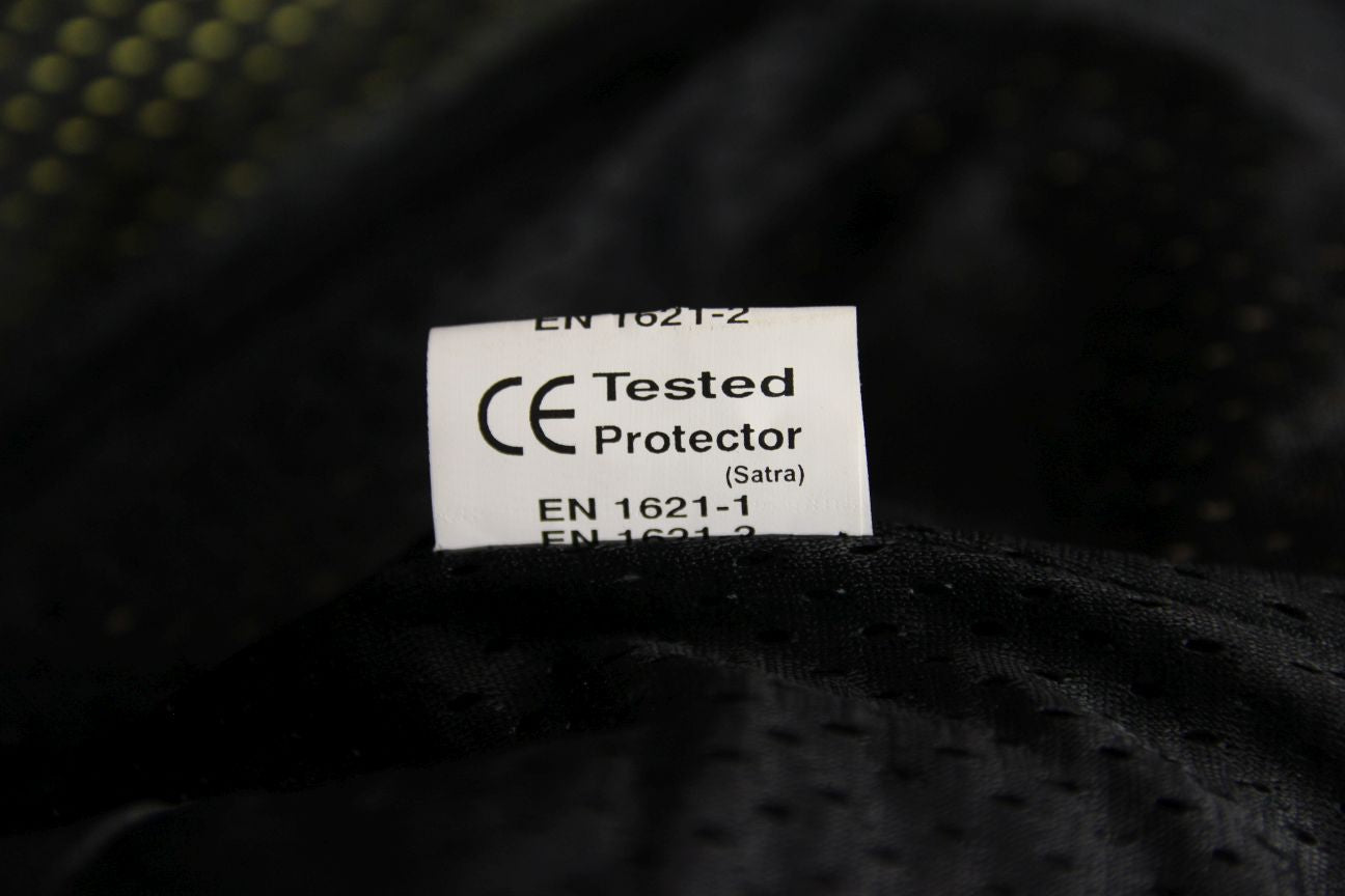 Supplied with removable CE armour at the back, shoulders & elbows/forearms, all held in velcro fastened 'pockets' on the lining. There is also some built in light padding at the shoulders & elbows/forearms.