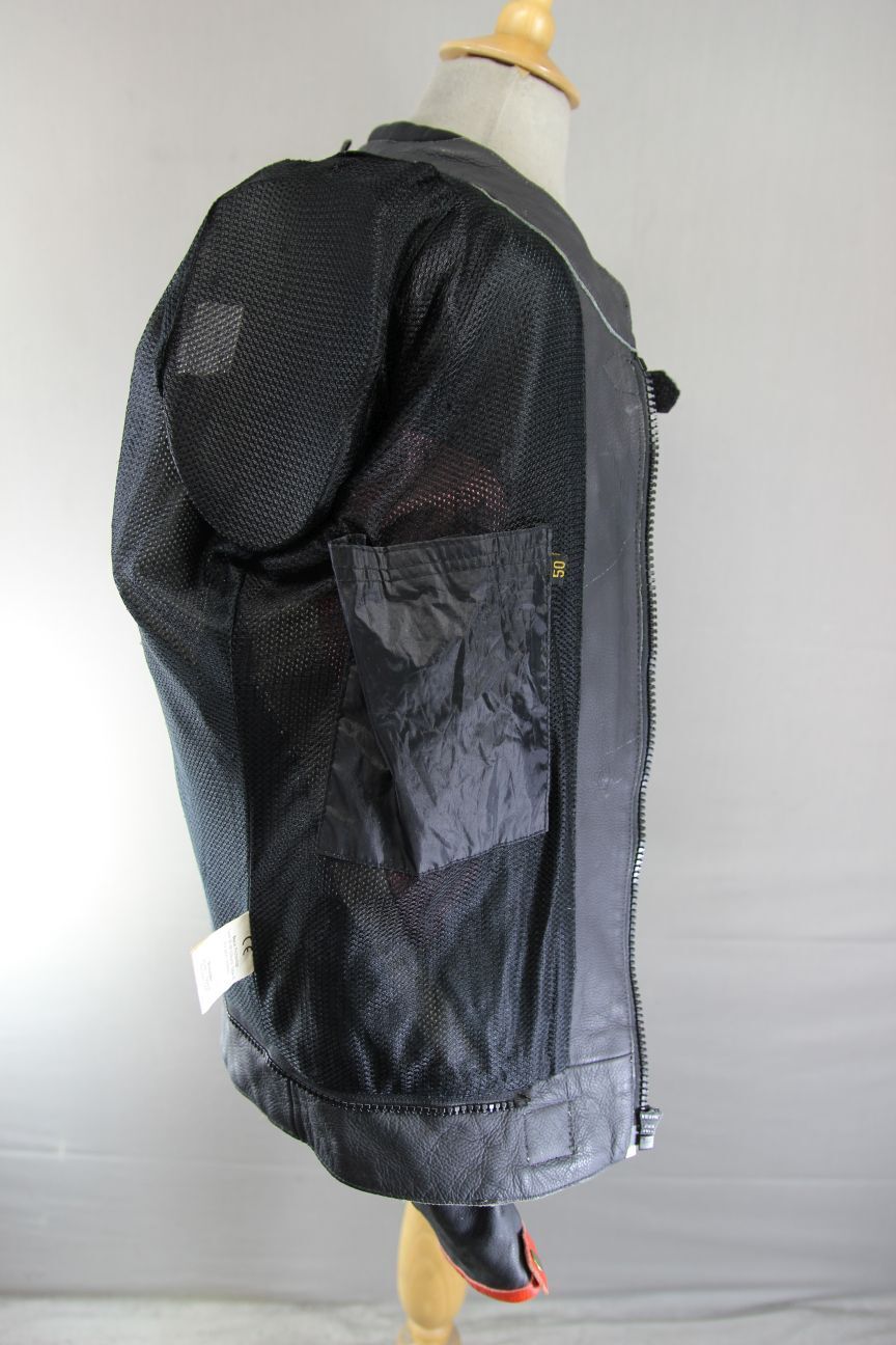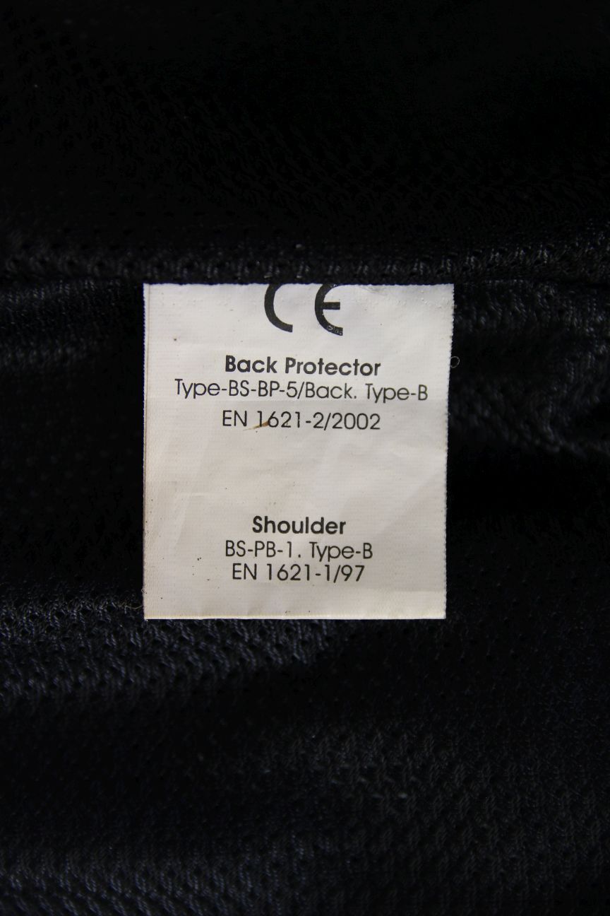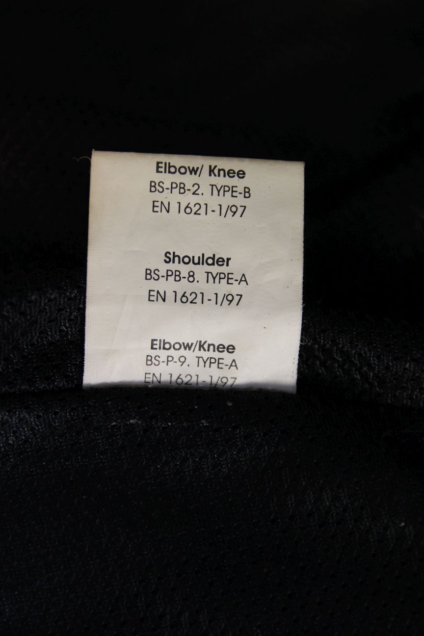 Fitted with removable armour at the back, shoulders and elbows/forearms, all held in velcro fastened 'pockets' on the lining. The armour is CE approved, see photos of label. There is some padding built into the jacket at the shoulders and elbows as well.