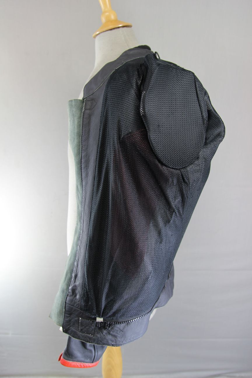 Black, red & white leather. Partly made from a breathable black kevlar type textile material and the jacket has a breathable black lining.