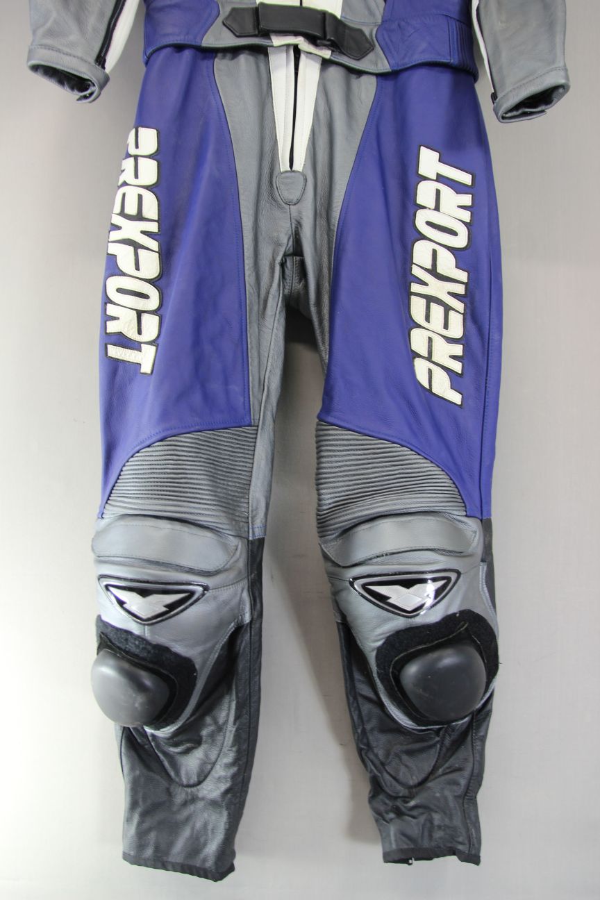 PREXPORT LADIES 2 PIECE BLUE & SILVER LEATHER BIKER SUIT + CE ARMOUR: SIZE 14-16