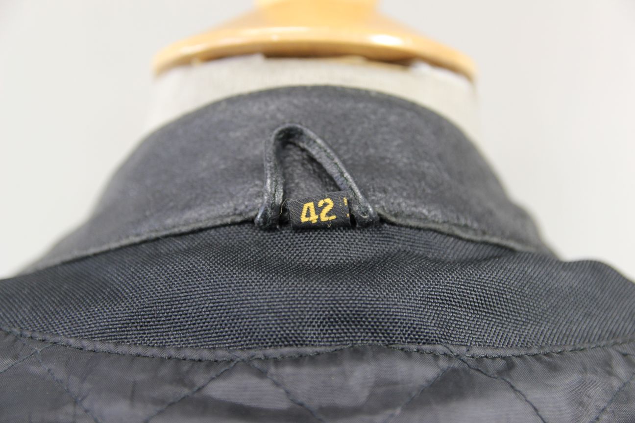 The jacket has a quilted black lining.