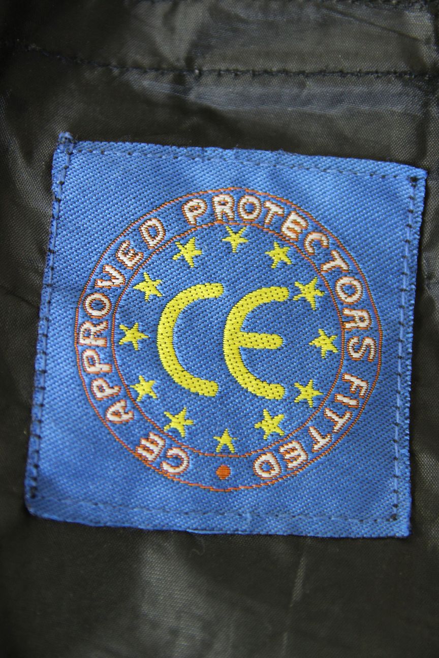 Supplied with removable protectors at the back, shoulders, elbows/forearms, hips & knees, extending down the shins, all held in velcro fastened 'pockets' on the lining. The back & hip protectors are made from fairly thick foam; the other protectors are all CE approved armour. The knee/shin armour pockets are on the inside of the lining (there are zipped openings in the lining at the bottom of the legs to access them). There are external metal (probably titanium) shoulder and knee protectors (see photos) and there is built in padding at the shoulders, elbows/forearms and knees. Comes with a removable race hump, held in a zipped pocket on the inside of the leather (there is another zipped opening in the lining to access this). Fitted with velcro attached knee sliders, as pictured.